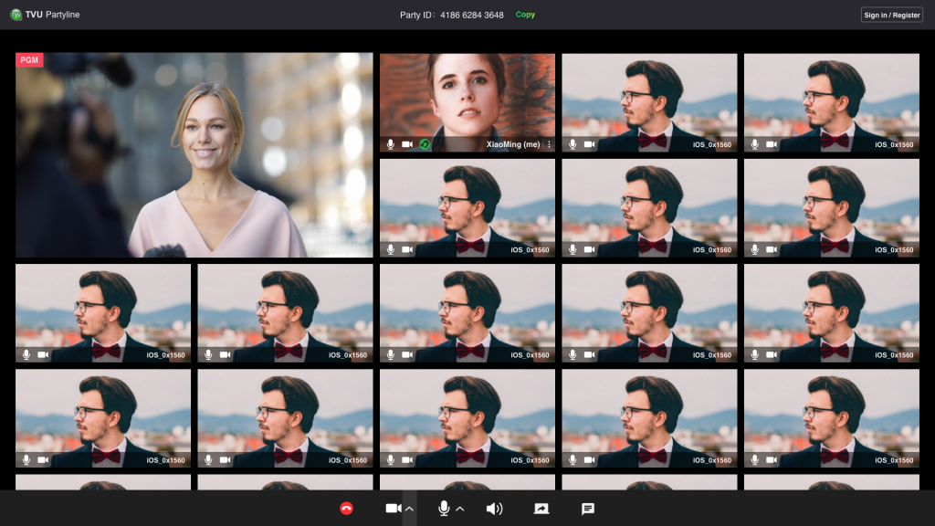 The remote participant can now see this user interface on the TVU Anywhere App and engage in a video conference with all other remote participants on the Partyline.